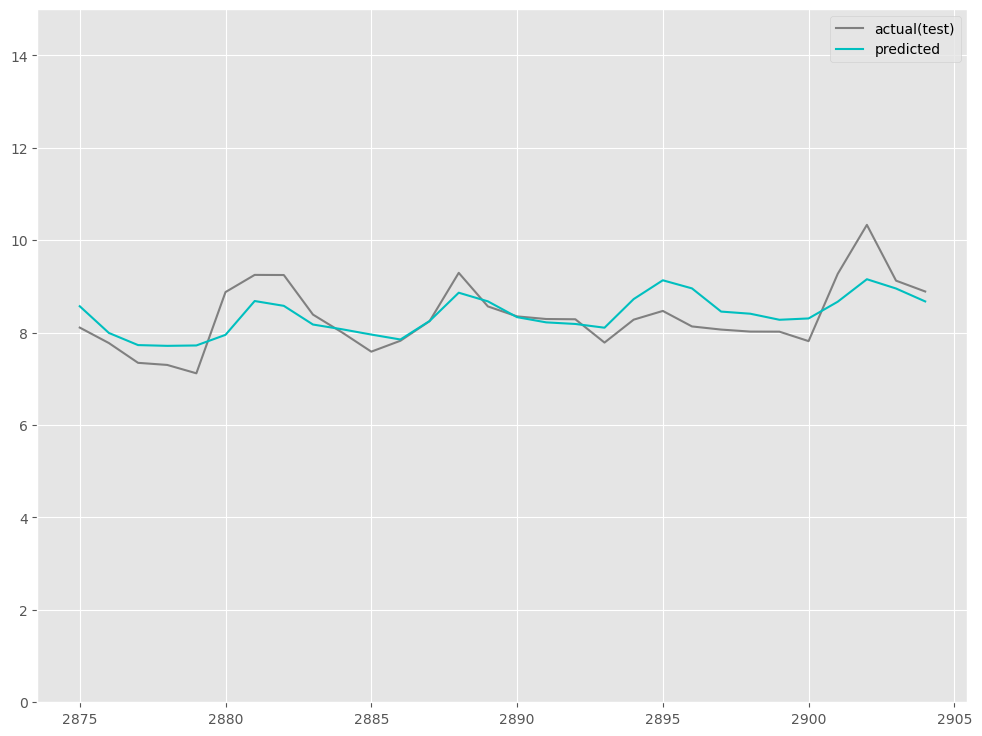 # # グラフ(予測値と実測値) # fig, ax = plt.subplots() ax.set_ylim([0, 15]) # 実測値の描写 ax.plot(df.index[-output_sequence:], df.y[-output_sequence:], label='actual(test)', color='gray') # 予測値の描写 ax.plot(df.index[-output_sequence:], test_pred, label="predicted", color="c") # 凡例表示 ax.legend() plt.show()