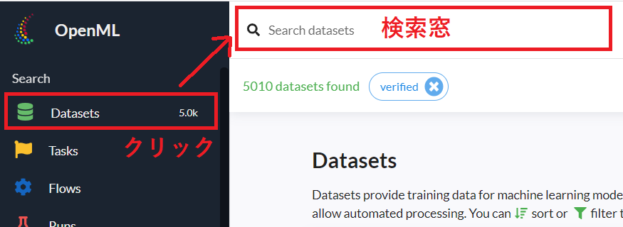 データセットを検索するときは、Datasetsをクリックし検索窓を表示させ、そこにキワードを入力し検索するだけです。