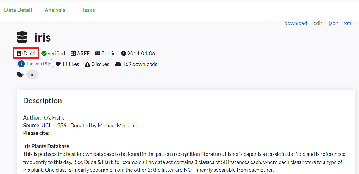 アヤメのデータ(iris)のIDは「61」のため「dataset_id=61」としています。