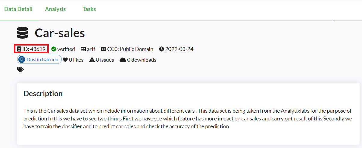 車の販売データ(Car-sales)のIDは「43619」のため「dataset_id=43619」としています。