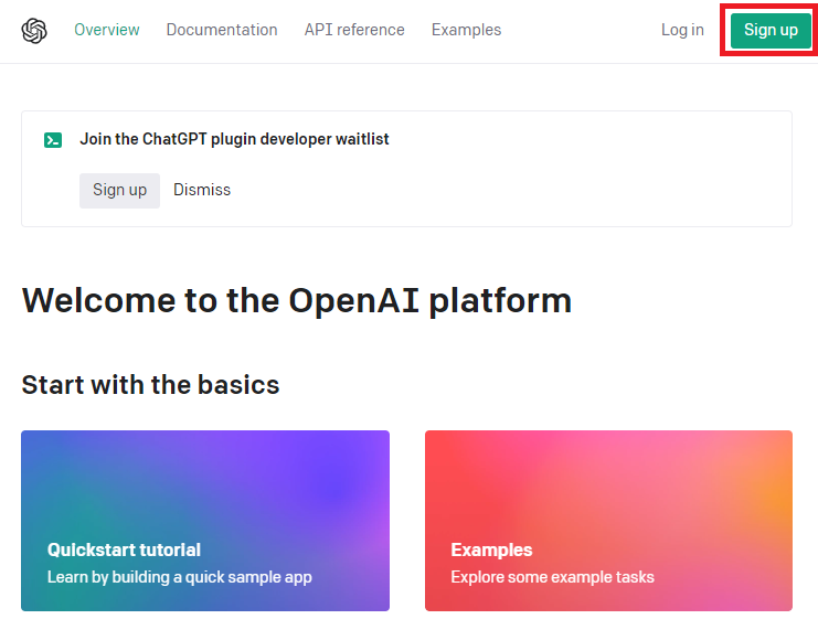 OpenAI platformhttps://platform.openai.com/overview)を開き、Sign upをクリックします。