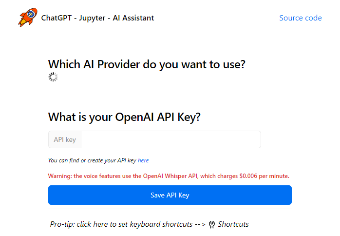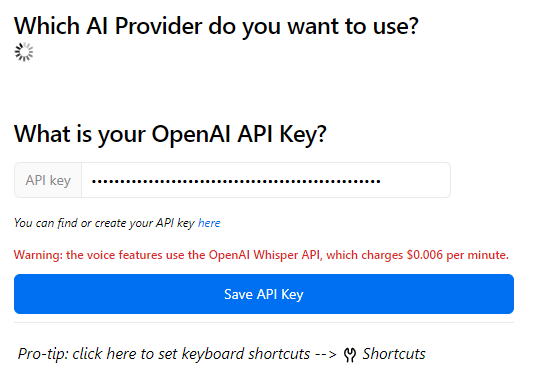 以下のような画面が表示されOpenAI API Keyの入力を促されます。