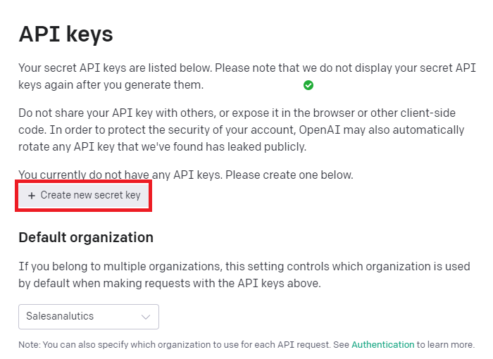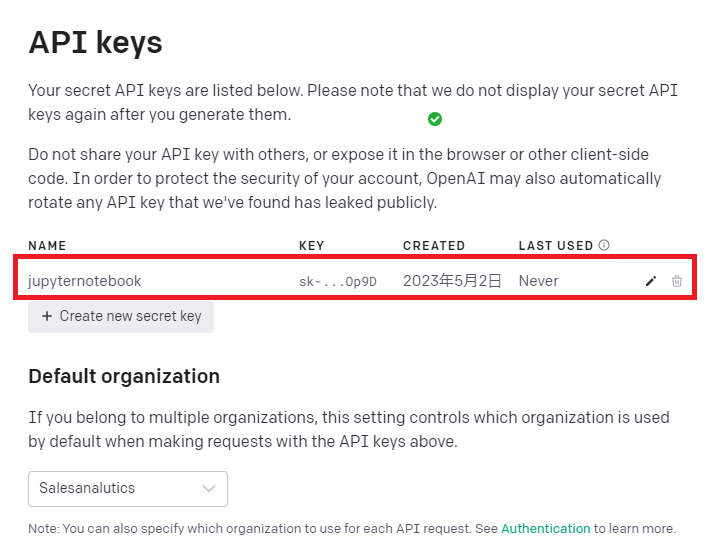 OpenAI API Keyが作成されると、元の画面に戻ります。作成されたことが画面から確認できるかと思います。