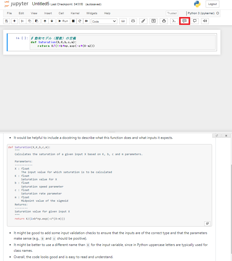 ChatGPTJupyter Notebookに統合することで、Pythonコードを整えたりレビューしたり改善案を出したりコード例を提示したりしてくれます。