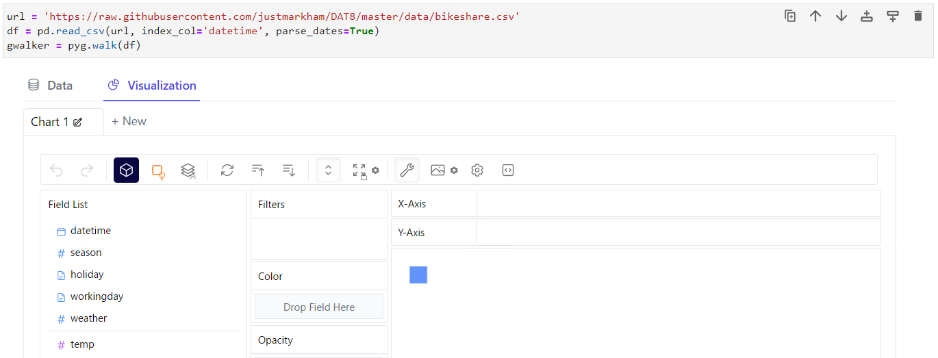 PyGWalkerを利用すると、Notebook上でほぼドラッグ&ドロップ操作のみで、効率的かつ効果的にデータを探索したり分析したりすることができます。