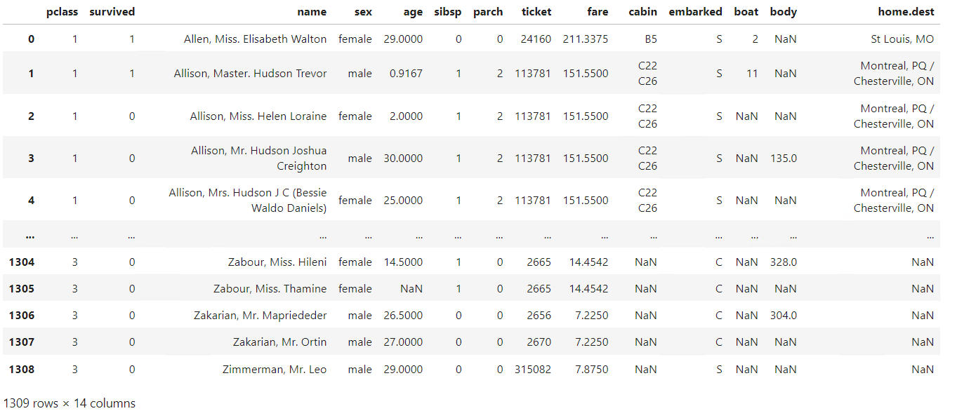 from sklearn.datasets import fetch_openml dataset = fetch_openml(data_id=40945, parser='auto') df = dataset['frame'] df #確認