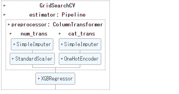 # 基本的なモジュール import numpy as np import pandas as pd # データ分割用の関数 from sklearn.model_selection import train_test_split # 評価指標 from sklearn.metrics import r2_score # ハイパーパラメータ調整 from sklearn.model_selection import GridSearchCV # パイプライン構築のための道具 from sklearn.pipeline import make_pipeline from sklearn.pipeline import Pipeline from sklearn.compose import ColumnTransformer # 今回、変換器として利用 from sklearn.preprocessing import StandardScaler from sklearn.preprocessing import OneHotEncoder from sklearn.impute import SimpleImputer # 今回、推定器として利用 import xgboost as xgb