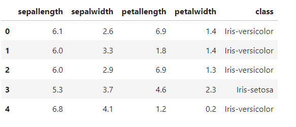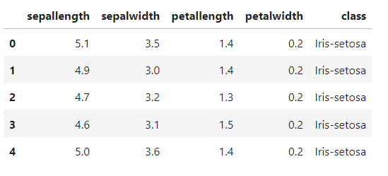 <class 'pandas.core.frame.DataFrame'> RangeIndex: 150 entries, 0 to 149 Data columns (total 5 columns): # Column Non-Null Count Dtype --- ------ -------------- ----- 0 sepallength 150 non-null float64 1 sepalwidth 150 non-null float64 2 petallength 150 non-null float64 3 petalwidth 150 non-null float64 4 class 150 non-null object dtypes: float64(4), object(1) memory usage: 6.0+ KB