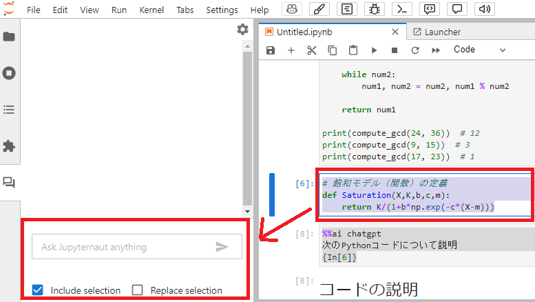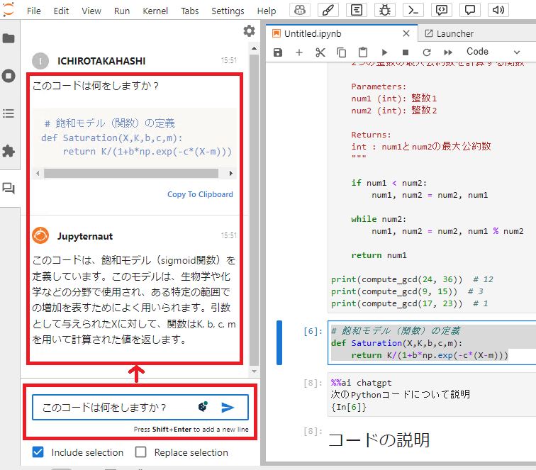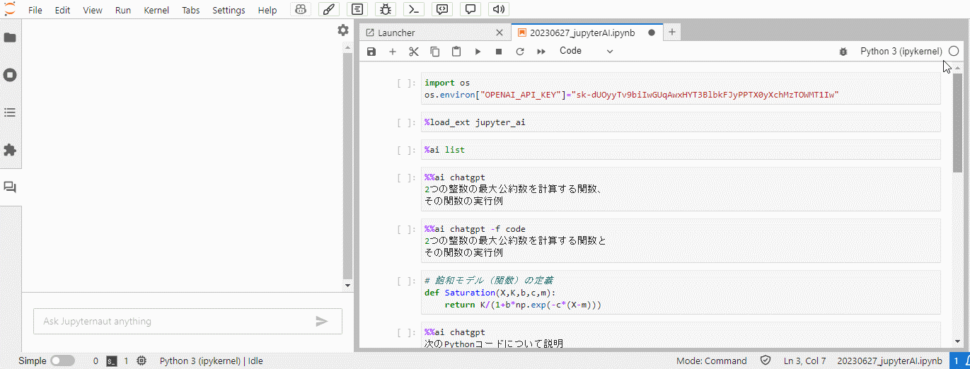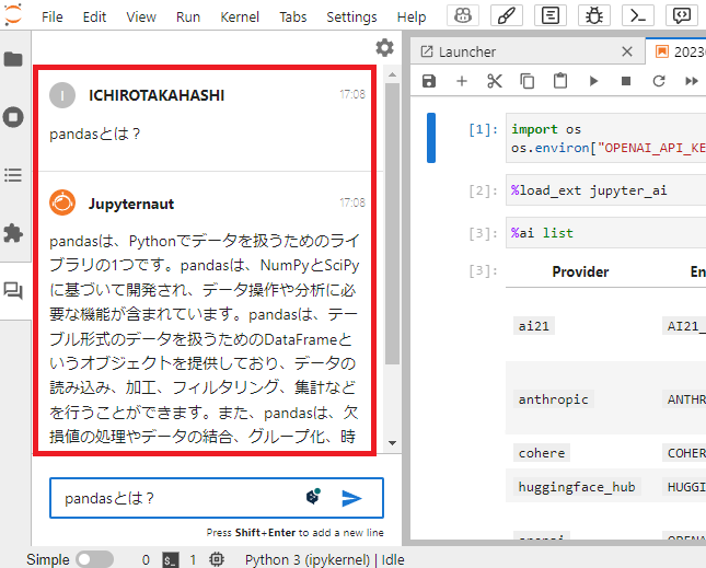 この ChatGPT を Jupyter Lab に追加する機能が Jupyter AIです。