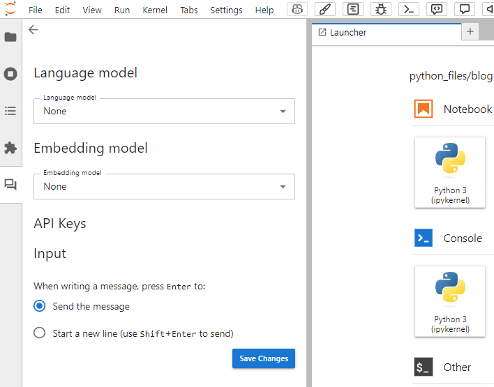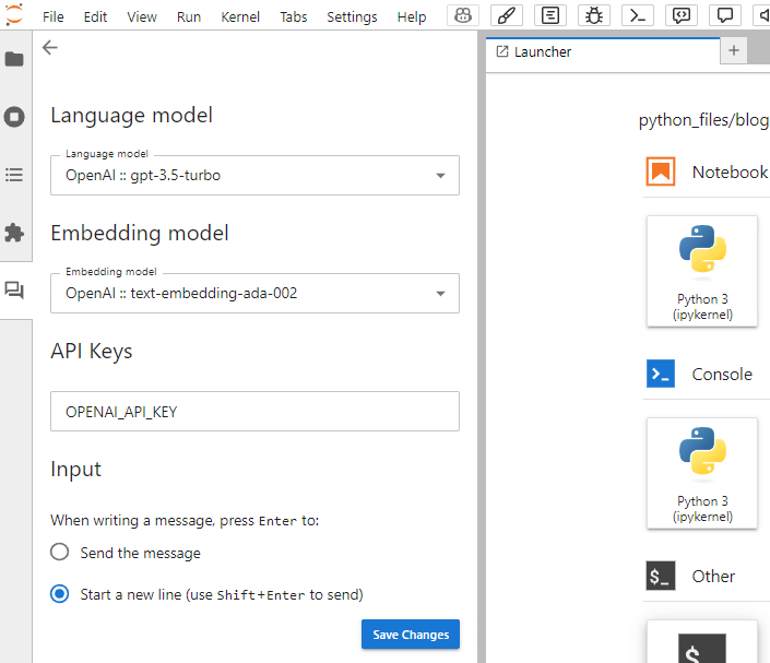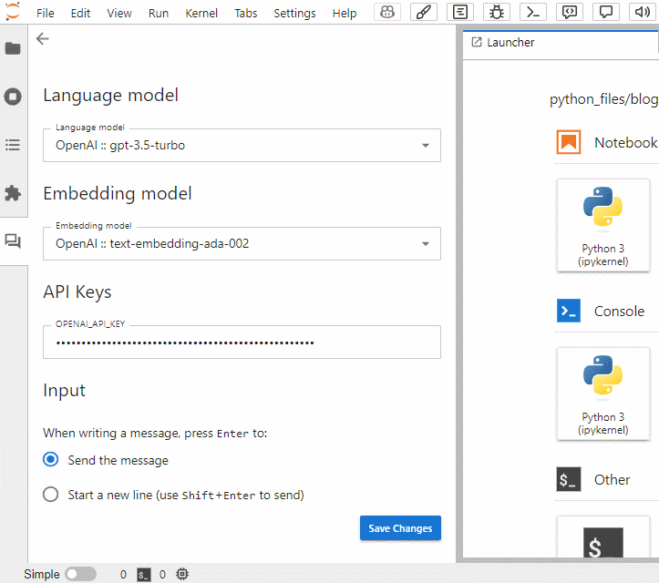 特定のプロバイダでJupyter AIを使用するには、そのPythonパッケージをインストールし、APIキー(またはその他の認証情報)を環境またはチャットインターフェースに設定する必要があります。