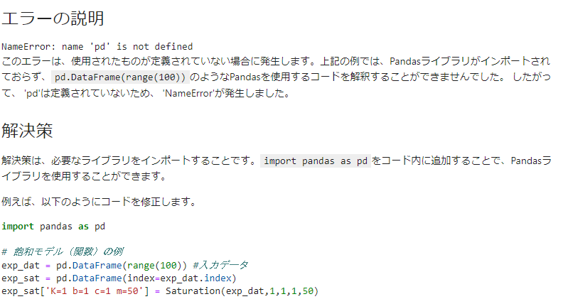 以下は、チャットインターフェイス(プロンプトを入力する部分)に、「pandasとは?」と質問し実行した結果です。