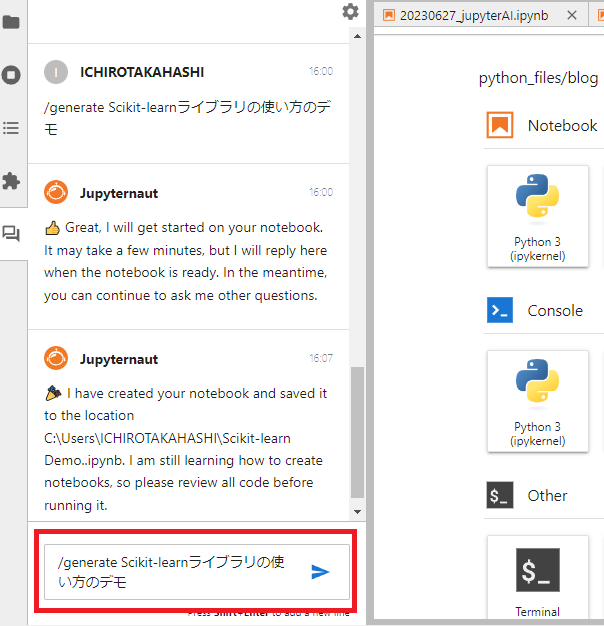 例えば、Scikit-learnの使い方を知るためのデモを行うノートブック(ipynbファイル)を作ってもらいます。