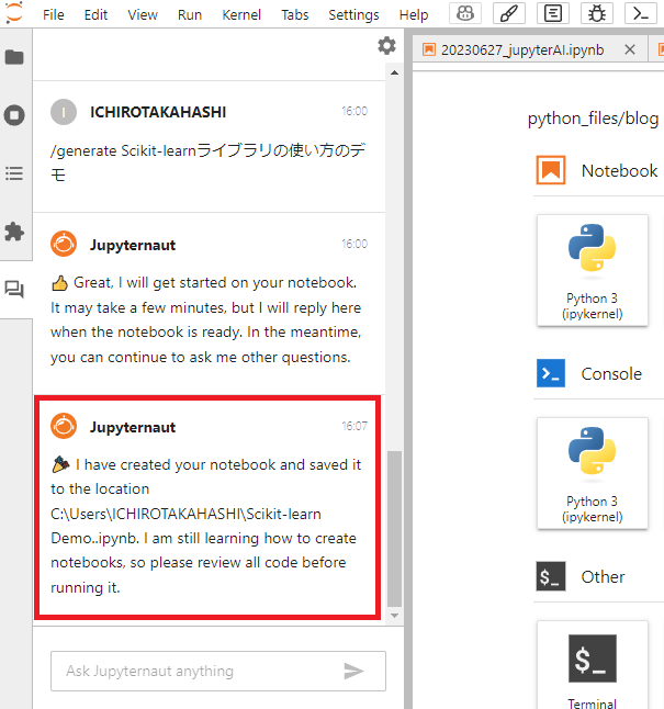 しばらくすると、以下のような「ノートブックを生成し〇〇に保存した……」( I have created your notebook and saved it to the location……)というメッセージが表示されます。