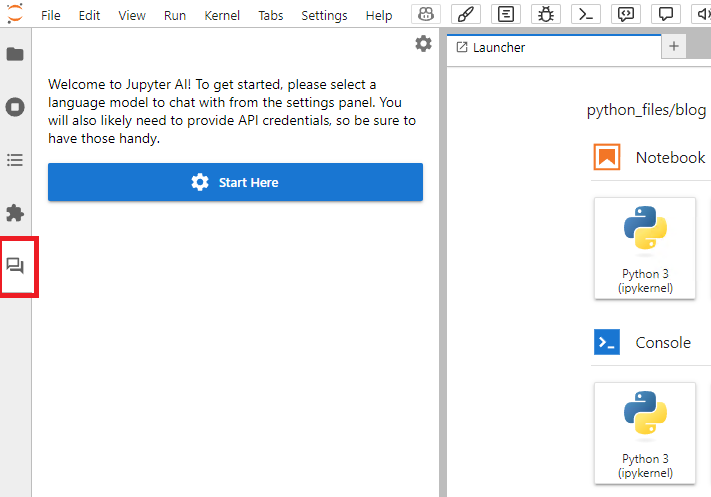 起動すると、Jupyter Labの左サイドパネルに新しい「chatアイコン」が表示されます。