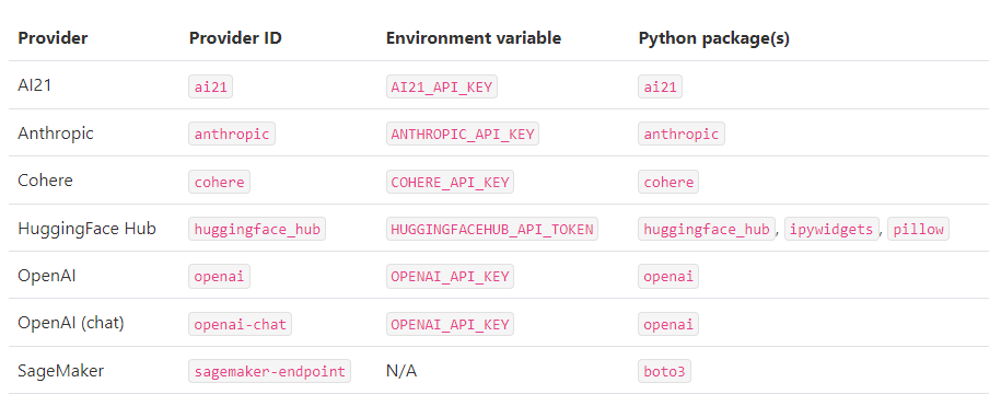 以下は、今現在(2023年6月26日現在)対応しているモデルプロバイダー一覧(https://jupyter-ai.readthedocs.io/en/latest/users/index.html#model-providers)です。