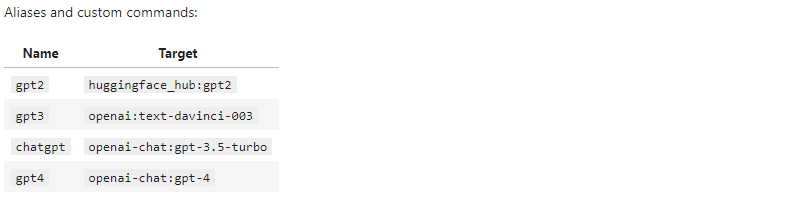 今回は「openai-chat:gpt-3.5-turbo」を設定しているので、「chatgpt」を名前(Name)に指定して使います。