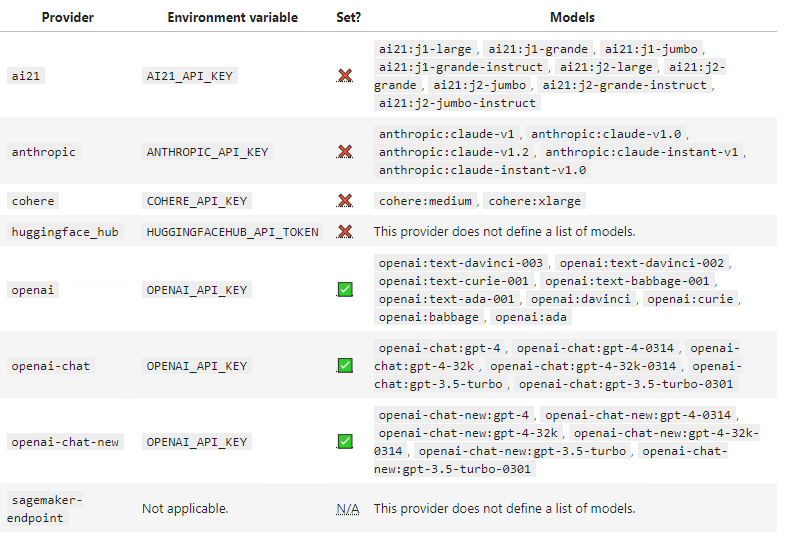 では、利用可能なプロバイダーとモデルをリストアップしてみましょう。
