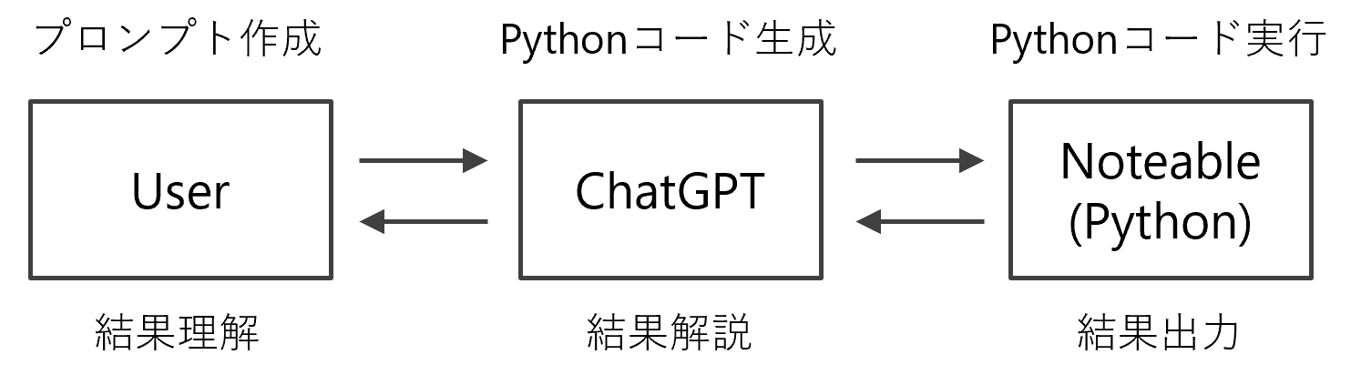 Noteableプラグインを使ったデータ分析は、裏でNoteableが動いているため、NoteableのPython環境をユーザが設定することで、ChatGPTを使ったデータ分析の環境を設定することができます。