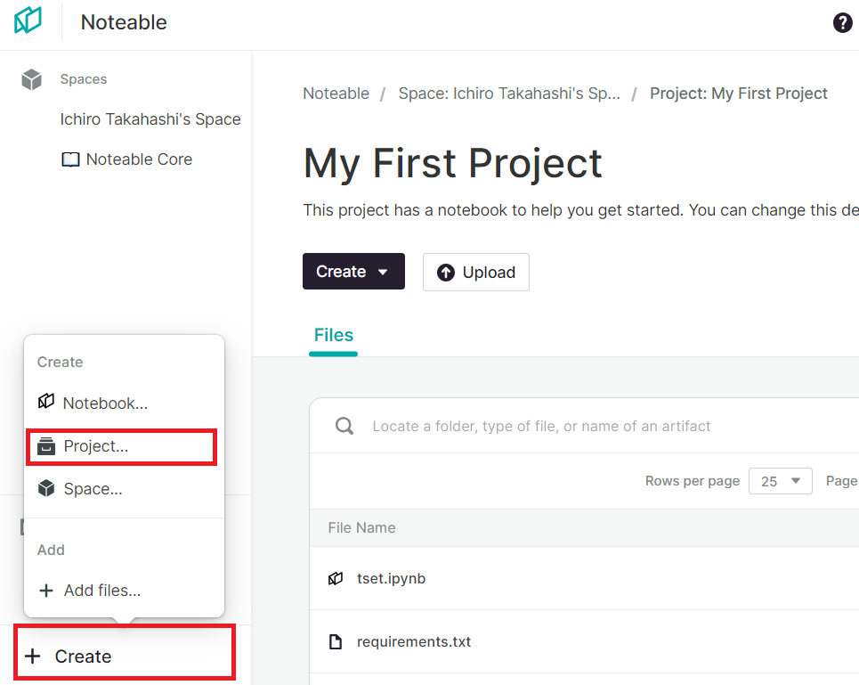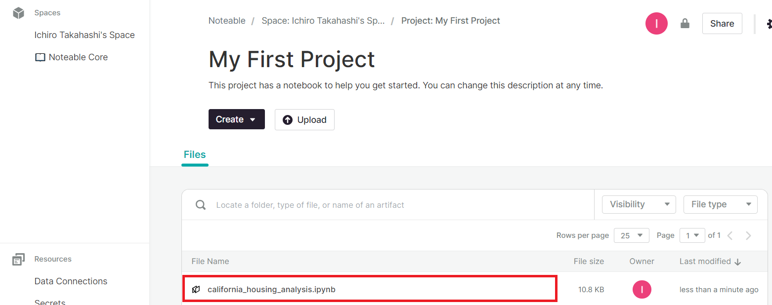 指定したNoteableのプロジェクト内に、Notebookが作られそこでデータ分析が行われ記録されます。