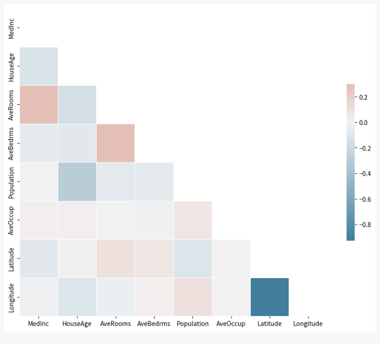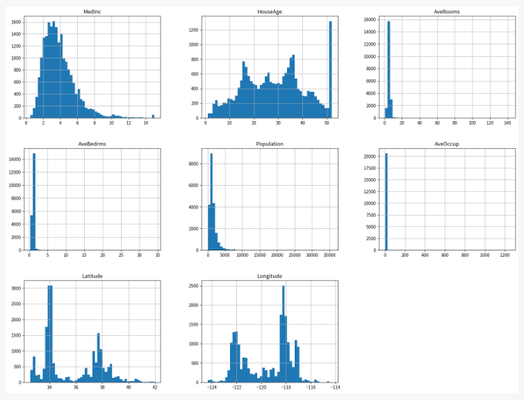scikit-learnから提供されているカリフォルニアの住宅価格データセット(fetch_california_housing)を使います。 目的変数はyに、特徴量はXに格納して下さい。 データ理解のために、データの可視化と探索的データ分析をして下さい。