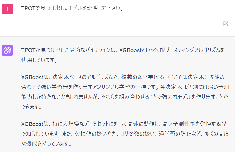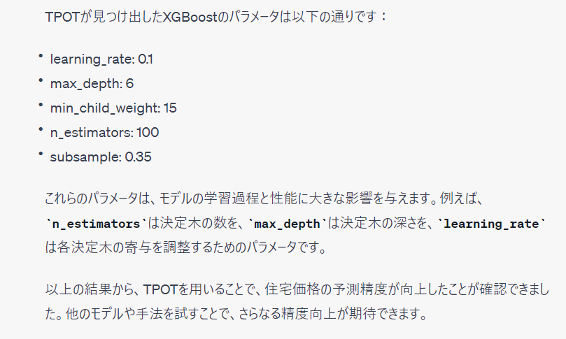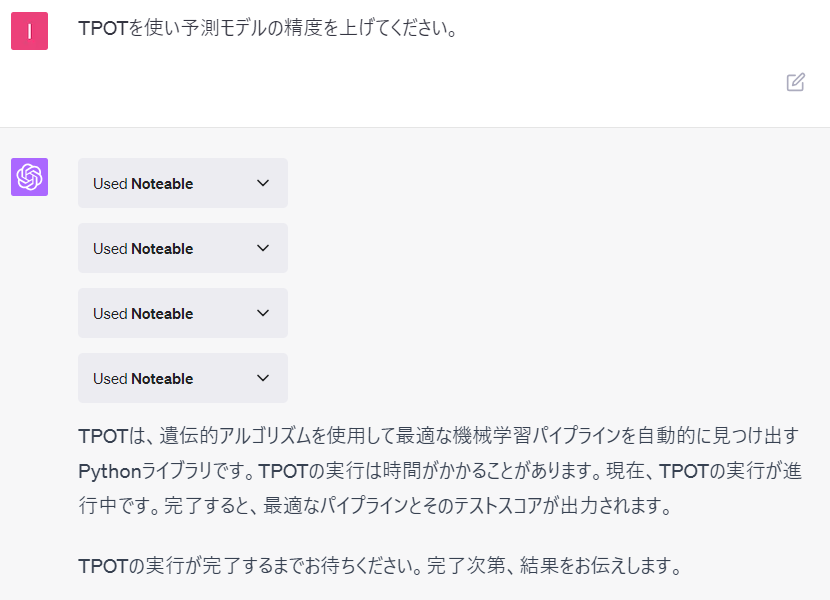 PythonのAutoML(自動機械学習)パッケージであるTPOTを使い、より高精度な予測モデルを作ってもらいます。