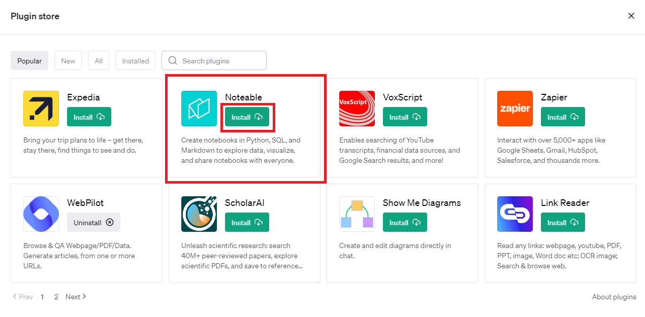 Plugin storeが表示されましたら、「Noteable」を探し「Install」をクリックします。