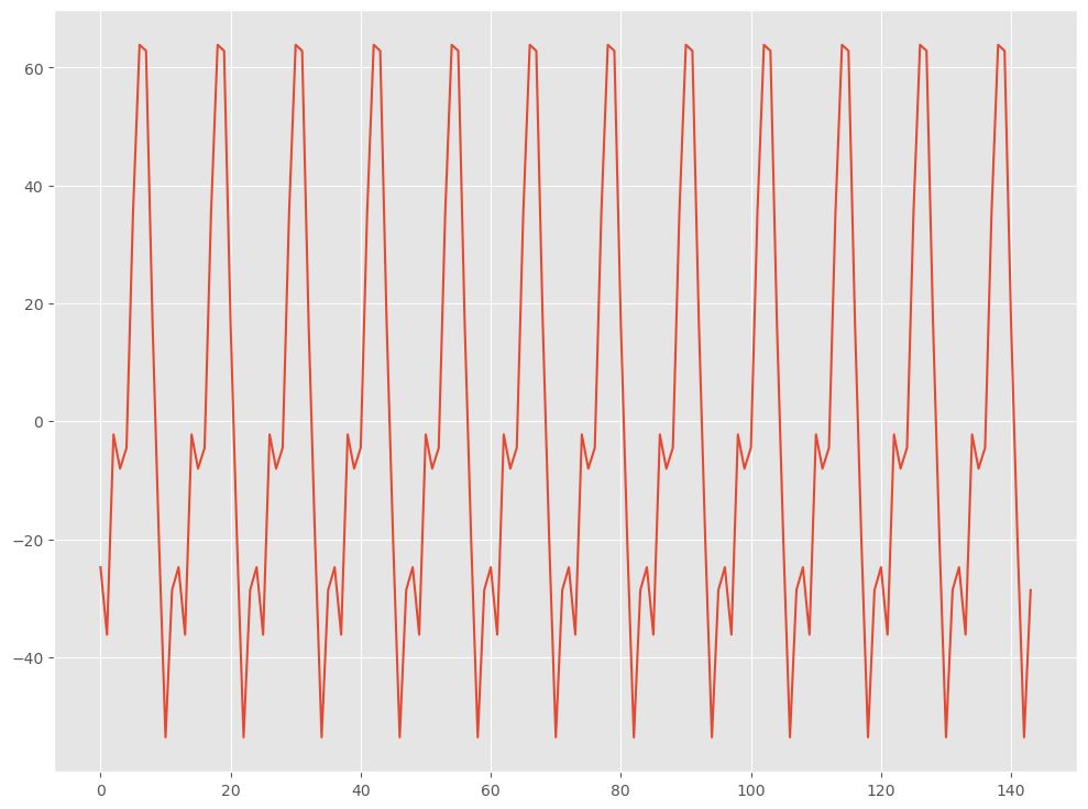 result.seasonalは抽出した季節成分のデータを示しており、それをplot関数でグラフ化します。最後にplt.show()でグラフを表示します。