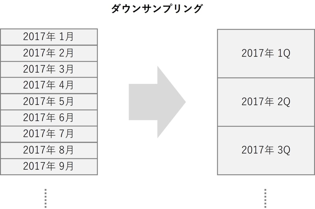 例えば、1カ月(M)ごとのデータを四半期(Q)ごとのデータに変換することなどがダウンサンプリングに該当します。