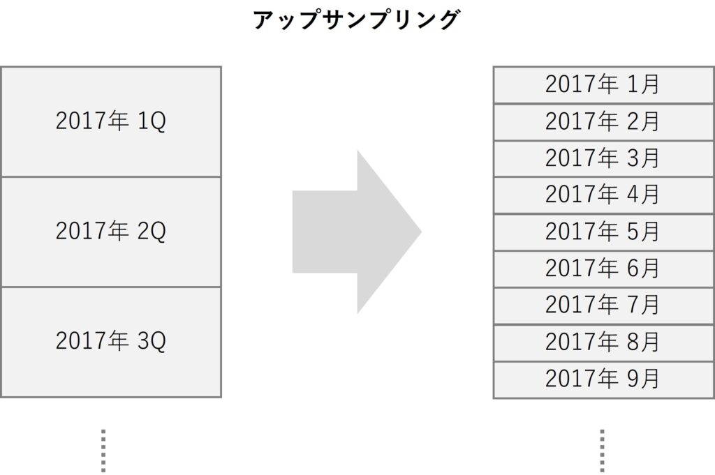 例えば、四半期(Q)ごとのデータを1カ月(M)ごとのデータに変換することなどがアップサンプリングに該当します。