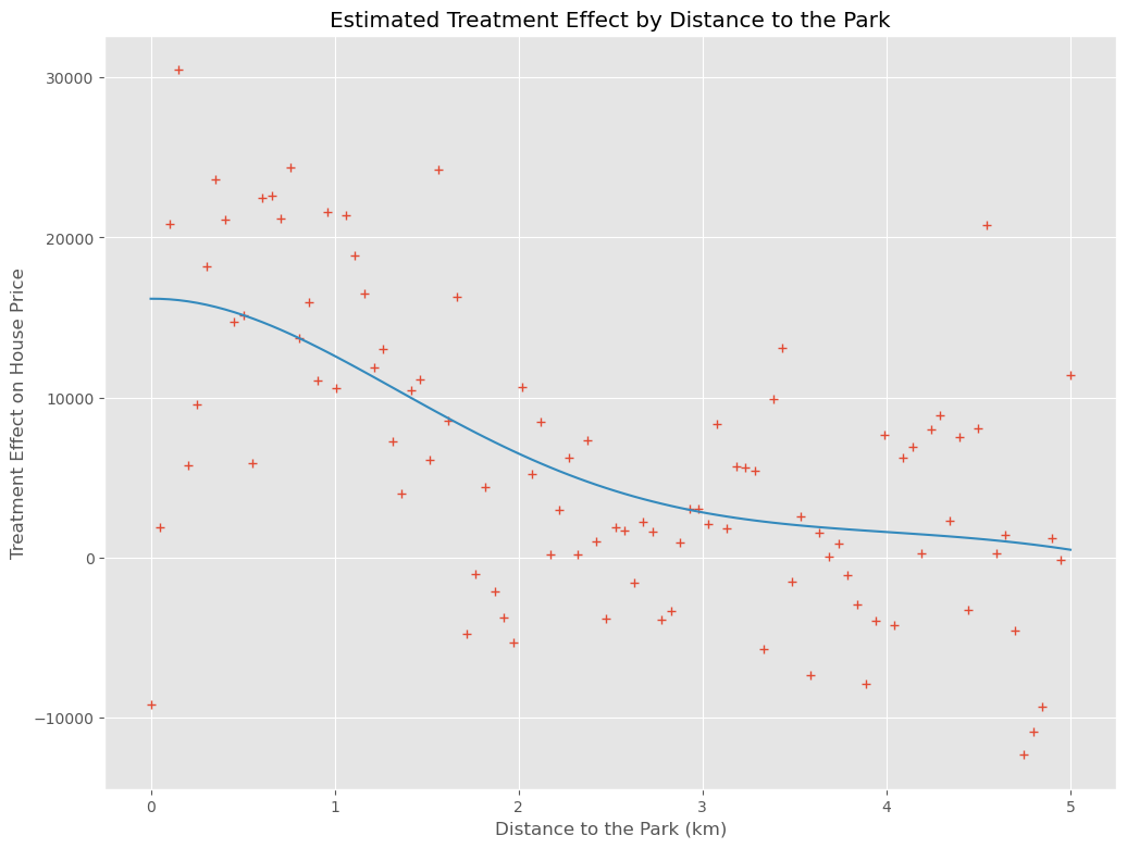 新しい公園の開設が近隣の家の価格に与える影響を、家から公園までの距離に応じて評価しています。