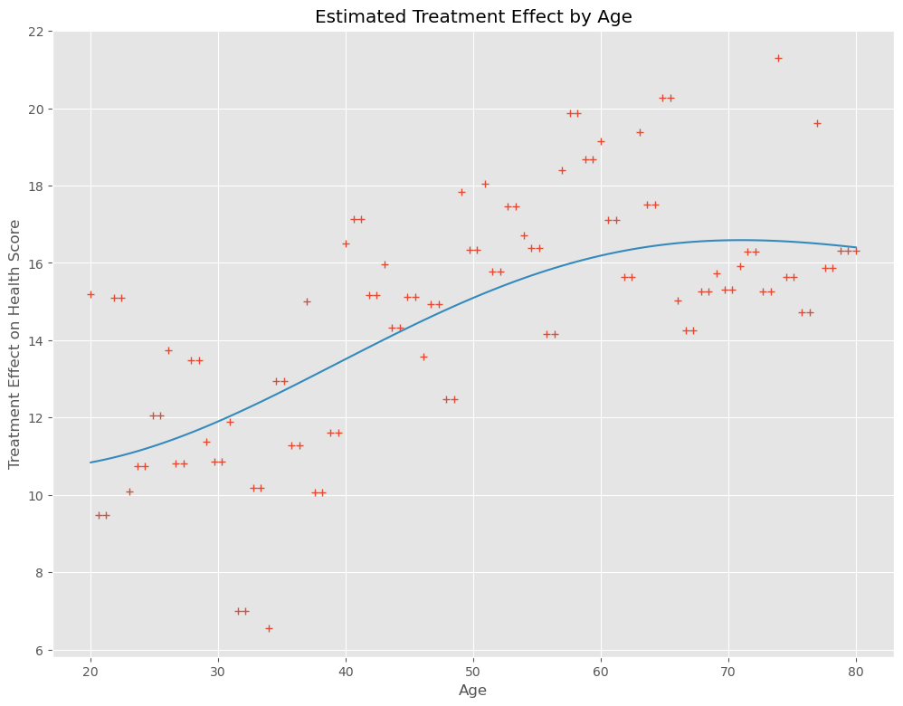 # 年齢ごとの因果効果の推定 X_test = np.linspace(20, 80, 100).reshape(-1, 1) treatment_effects = model.effect(X_test)