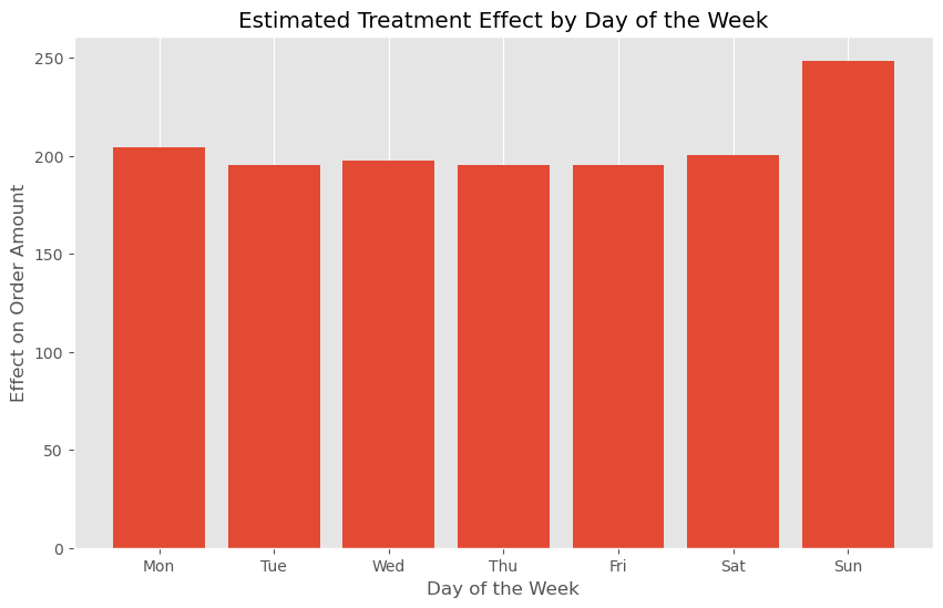 # 曜日ごとの因果効果の推定 X_test = np.arange(7).reshape(-1, 1) treatment_effects = model.effect(X_test)