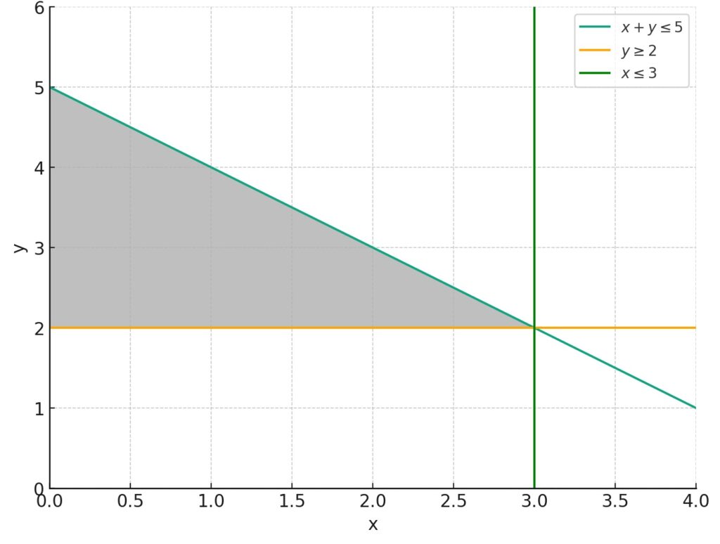 \displaystyle \begin{matrix} x+y \le 5 \\ x \le 3 \\ y \ge 2 \\ x,y \ge 0\end{matrix}