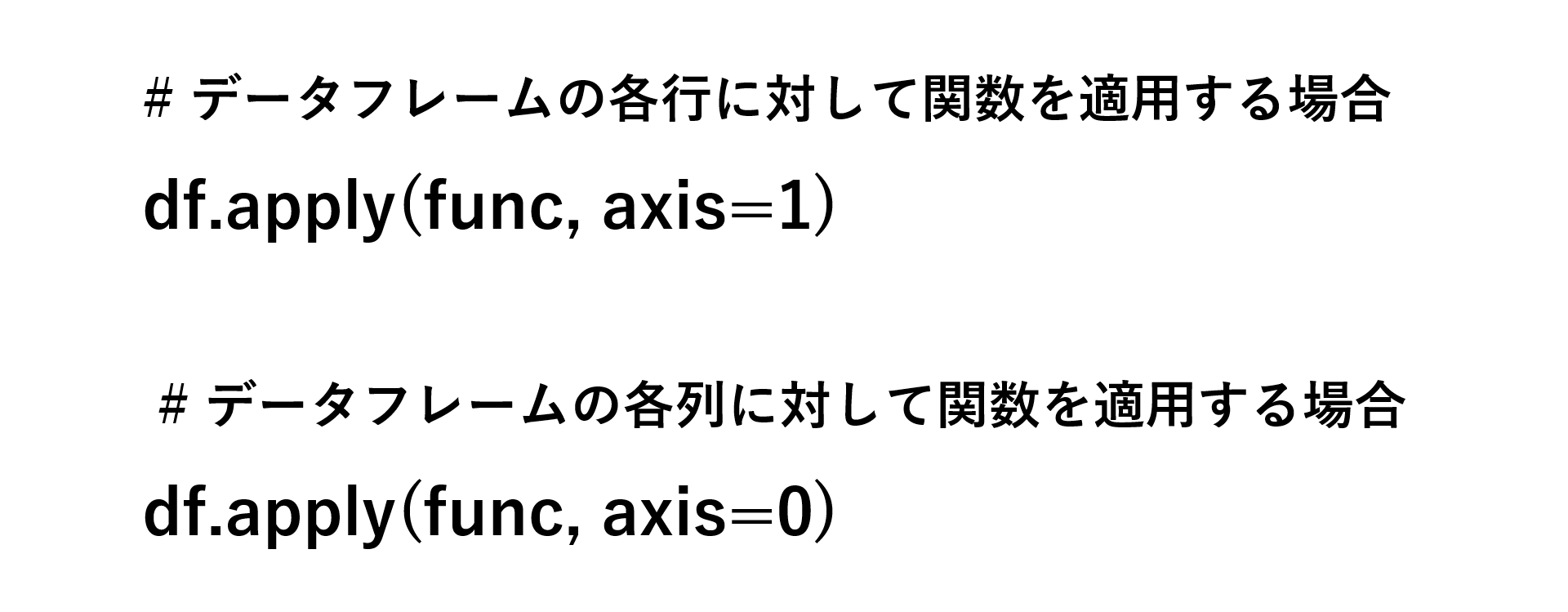 ここで、funcは適用したい関数を表し、axisは適用する方向を指定します。axis=1は横方向、axis=0は縦方向を意味します