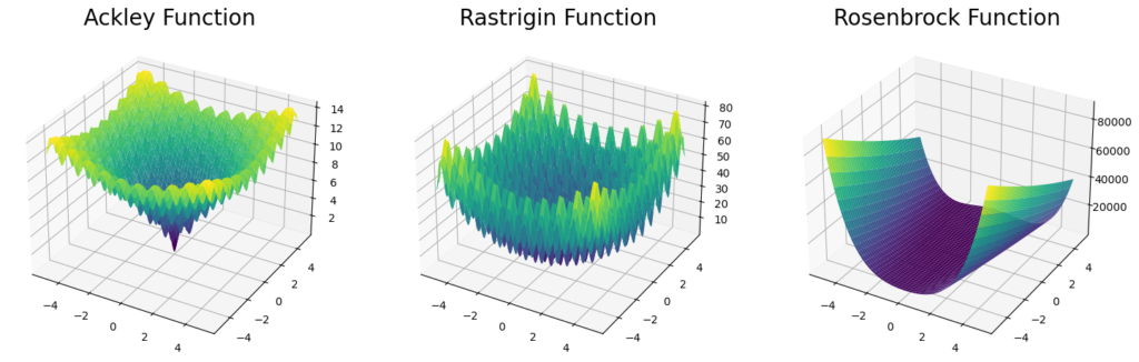 代表的なベンチマーク問題の目的関数として用いるものに、Ackley関数、Rastrigin関数、Rosenbrock関数などがあります。今回いくつか利用しました。