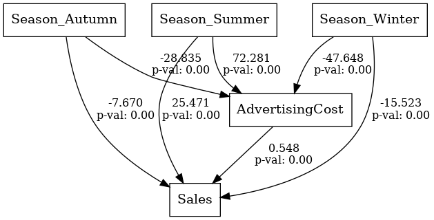 G.add_edge(edge[0], edge[1], label=f"Coef: {edge[2][0]:.2f}, \n P-Value: {edge[2][1]:.2e}")