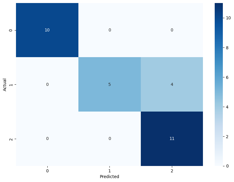 1/1 [==============================] - 0s 71ms/step Predicted: [0.21028955 0.38535288 0.40435767], Actual: 1 Predicted: [0.97337353 0.01331554 0.01331093], Actual: 0 Predicted: [0.06612273 0.07690746 0.8569697 ], Actual: 2 Predicted: [0.18027289 0.3610332 0.45869386], Actual: 1 Predicted: [0.17180614 0.27961496 0.548579 ], Actual: 1