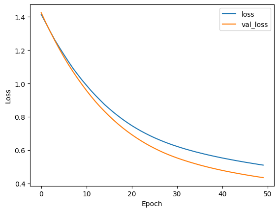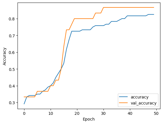 Epoch 1/50 4/4 [==============================] - 0s 44ms/step - loss: 1.0195 - accuracy: 0.5083 - val_loss: 0.9661 - val_accuracy: 0.6667 Epoch 2/50 4/4 [==============================] - 0s 6ms/step - loss: 0.9993 - accuracy: 0.5500 - val_loss: 0.9428 - val_accuracy: 0.6667 Epoch 3/50 4/4 [==============================] - 0s 6ms/step - loss: 0.9785 - accuracy: 0.5667 - val_loss: 0.9204 - val_accuracy: 0.7000 Epoch 4/50 4/4 [==============================] - 0s 6ms/step - loss: 0.9583 - accuracy: 0.5833 - val_loss: 0.8990 - val_accuracy: 0.7333 Epoch 5/50 4/4 [==============================] - 0s 6ms/step - loss: 0.9391 - accuracy: 0.6167 - val_loss: 0.8773 - val_accuracy: 0.7667 Epoch 6/50 4/4 [==============================] - 0s 6ms/step - loss: 0.9203 - accuracy: 0.6250 - val_loss: 0.8555 - val_accuracy: 0.7667 Epoch 7/50 4/4 [==============================] - 0s 6ms/step - loss: 0.9006 - accuracy: 0.6500 - val_loss: 0.8341 - val_accuracy: 0.7667 Epoch 8/50 4/4 [==============================] - 0s 6ms/step - loss: 0.8813 - accuracy: 0.6583 - val_loss: 0.8132 - val_accuracy: 0.7667 Epoch 9/50 4/4 [==============================] - 0s 6ms/step - loss: 0.8612 - accuracy: 0.6750 - val_loss: 0.7925 - val_accuracy: 0.7667 Epoch 10/50 4/4 [==============================] - 0s 6ms/step - loss: 0.8430 - accuracy: 0.6917 - val_loss: 0.7712 - val_accuracy: 0.7667 Epoch 11/50 4/4 [==============================] - 0s 6ms/step - loss: 0.8231 - accuracy: 0.6833 - val_loss: 0.7505 - val_accuracy: 0.8000 Epoch 12/50 4/4 [==============================] - 0s 6ms/step - loss: 0.8038 - accuracy: 0.7000 - val_loss: 0.7304 - val_accuracy: 0.8667 Epoch 13/50 4/4 [==============================] - 0s 6ms/step - loss: 0.7848 - accuracy: 0.7083 - val_loss: 0.7107 - val_accuracy: 0.8667 Epoch 14/50 4/4 [==============================] - 0s 6ms/step - loss: 0.7667 - accuracy: 0.7333 - val_loss: 0.6912 - val_accuracy: 0.8667 Epoch 15/50 4/4 [==============================] - 0s 6ms/step - loss: 0.7486 - accuracy: 0.7667 - val_loss: 0.6721 - val_accuracy: 0.8667 Epoch 16/50 4/4 [==============================] - 0s 6ms/step - loss: 0.7306 - accuracy: 0.7667 - val_loss: 0.6536 - val_accuracy: 0.8667 Epoch 17/50 4/4 [==============================] - 0s 6ms/step - loss: 0.7137 - accuracy: 0.7750 - val_loss: 0.6357 - val_accuracy: 0.8667 Epoch 18/50 4/4 [==============================] - 0s 6ms/step - loss: 0.6973 - accuracy: 0.7833 - val_loss: 0.6182 - val_accuracy: 0.8667 Epoch 19/50 4/4 [==============================] - 0s 6ms/step - loss: 0.6811 - accuracy: 0.8000 - val_loss: 0.6015 - val_accuracy: 0.8667 Epoch 20/50 4/4 [==============================] - 0s 6ms/step - loss: 0.6652 - accuracy: 0.8083 - val_loss: 0.5853 - val_accuracy: 0.8667 Epoch 21/50 4/4 [==============================] - 0s 6ms/step - loss: 0.6499 - accuracy: 0.8083 - val_loss: 0.5695 - val_accuracy: 0.8667 Epoch 22/50 4/4 [==============================] - 0s 6ms/step - loss: 0.6354 - accuracy: 0.8083 - val_loss: 0.5540 - val_accuracy: 0.8667 Epoch 23/50 4/4 [==============================] - 0s 6ms/step - loss: 0.6212 - accuracy: 0.8167 - val_loss: 0.5393 - val_accuracy: 0.8667 Epoch 24/50 4/4 [==============================] - 0s 6ms/step - loss: 0.6068 - accuracy: 0.8167 - val_loss: 0.5252 - val_accuracy: 0.9000 Epoch 25/50 4/4 [==============================] - 0s 6ms/step - loss: 0.5934 - accuracy: 0.8167 - val_loss: 0.5119 - val_accuracy: 0.9000 Epoch 26/50 4/4 [==============================] - 0s 6ms/step - loss: 0.5804 - accuracy: 0.8167 - val_loss: 0.4990 - val_accuracy: 0.9000 Epoch 27/50 4/4 [==============================] - 0s 6ms/step - loss: 0.5680 - accuracy: 0.8167 - val_loss: 0.4864 - val_accuracy: 0.9000 Epoch 28/50 4/4 [==============================] - 0s 6ms/step - loss: 0.5558 - accuracy: 0.8250 - val_loss: 0.4741 - val_accuracy: 0.9000 Epoch 29/50 4/4 [==============================] - 0s 6ms/step - loss: 0.5441 - accuracy: 0.8250 - val_loss: 0.4625 - val_accuracy: 0.9000 Epoch 30/50 4/4 [==============================] - 0s 6ms/step - loss: 0.5333 - accuracy: 0.8250 - val_loss: 0.4515 - val_accuracy: 0.9000 Epoch 31/50 4/4 [==============================] - 0s 6ms/step - loss: 0.5218 - accuracy: 0.8333 - val_loss: 0.4407 - val_accuracy: 0.9000 Epoch 32/50 4/4 [==============================] - 0s 6ms/step - loss: 0.5112 - accuracy: 0.8333 - val_loss: 0.4307 - val_accuracy: 0.9000 Epoch 33/50 4/4 [==============================] - 0s 6ms/step - loss: 0.5012 - accuracy: 0.8333 - val_loss: 0.4213 - val_accuracy: 0.9000 Epoch 34/50 4/4 [==============================] - 0s 6ms/step - loss: 0.4916 - accuracy: 0.8333 - val_loss: 0.4121 - val_accuracy: 0.9000 Epoch 35/50 4/4 [==============================] - 0s 6ms/step - loss: 0.4820 - accuracy: 0.8417 - val_loss: 0.4033 - val_accuracy: 0.9000 Epoch 36/50 4/4 [==============================] - 0s 6ms/step - loss: 0.4733 - accuracy: 0.8417 - val_loss: 0.3948 - val_accuracy: 0.9000 Epoch 37/50 4/4 [==============================] - 0s 6ms/step - loss: 0.4648 - accuracy: 0.8417 - val_loss: 0.3869 - val_accuracy: 0.9000 Epoch 38/50 4/4 [==============================] - 0s 6ms/step - loss: 0.4571 - accuracy: 0.8500 - val_loss: 0.3793 - val_accuracy: 0.9000 Epoch 39/50 4/4 [==============================] - 0s 6ms/step - loss: 0.4488 - accuracy: 0.8500 - val_loss: 0.3719 - val_accuracy: 0.9000 Epoch 40/50 4/4 [==============================] - 0s 6ms/step - loss: 0.4415 - accuracy: 0.8500 - val_loss: 0.3648 - val_accuracy: 0.9000 Epoch 41/50 4/4 [==============================] - 0s 6ms/step - loss: 0.4345 - accuracy: 0.8500 - val_loss: 0.3579 - val_accuracy: 0.9000 Epoch 42/50 4/4 [==============================] - 0s 6ms/step - loss: 0.4275 - accuracy: 0.8500 - val_loss: 0.3517 - val_accuracy: 0.9000 Epoch 43/50 4/4 [==============================] - 0s 6ms/step - loss: 0.4208 - accuracy: 0.8500 - val_loss: 0.3455 - val_accuracy: 0.9000 Epoch 44/50 4/4 [==============