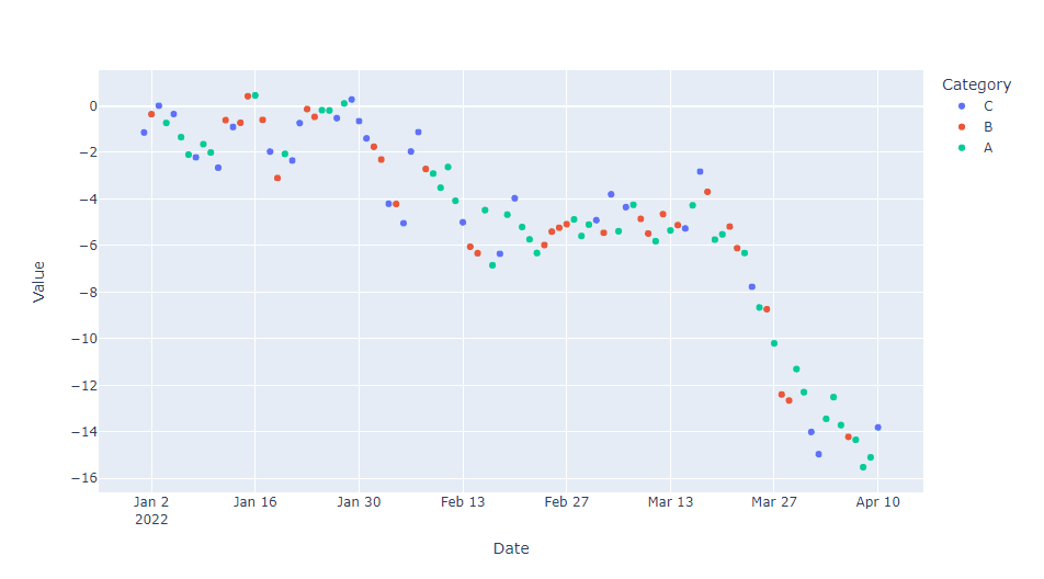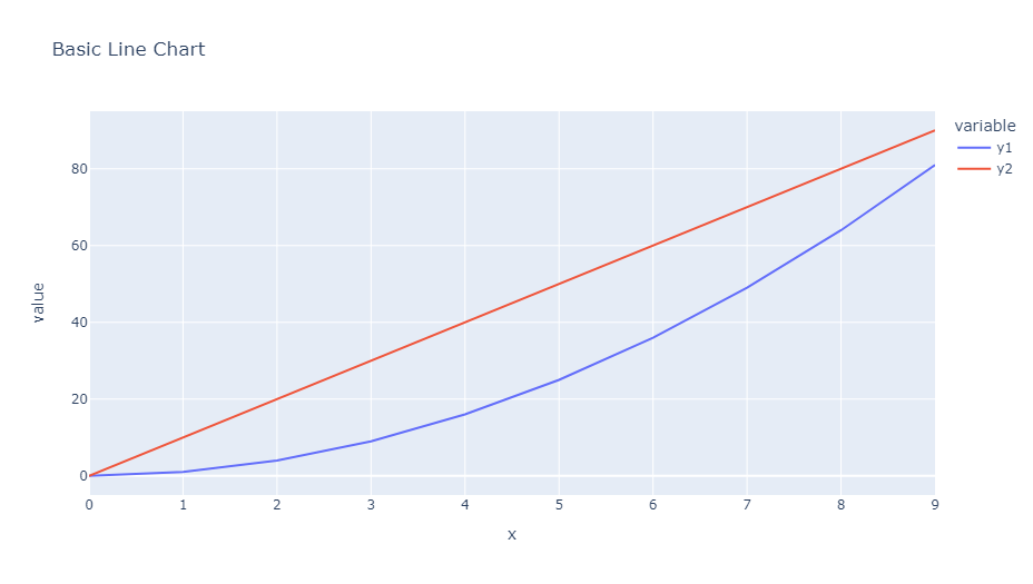 このコードでは、2つの異なる系列(y1とy2)を同じグラフ上に描画しています。px.line関数を使用することで、簡単にマルチライングラフを作成できます。