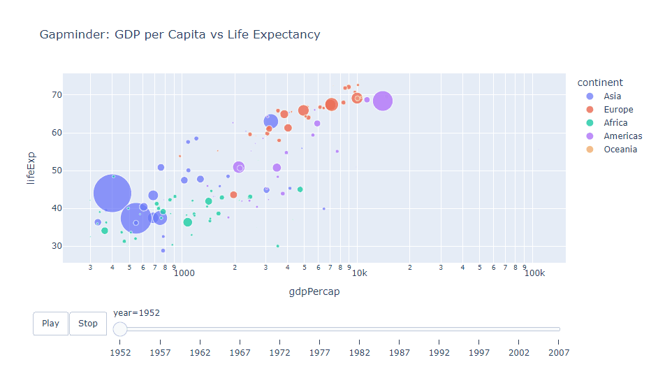 年ごとのGDPと平均寿命の関係を示すアニメーション付き散布図を作成します。ユーザーは再生ボタンを使ってアニメーションを制御できます。