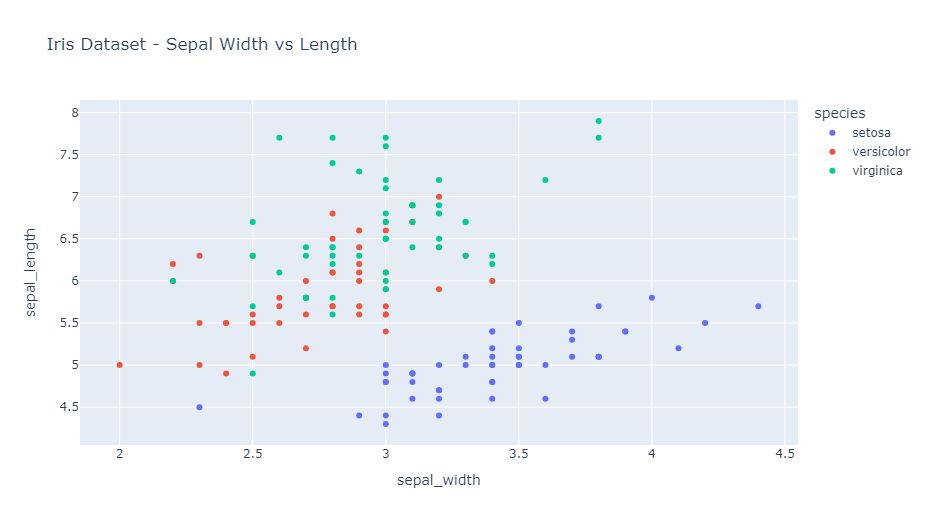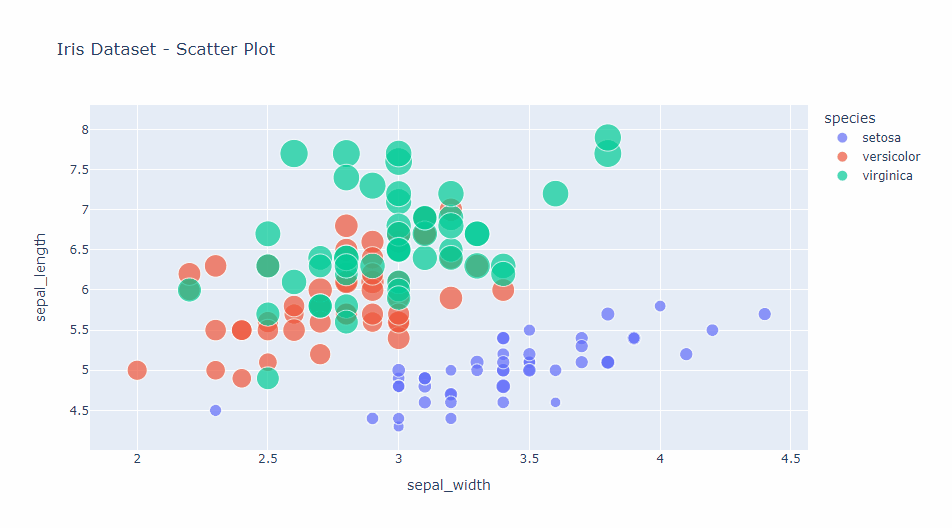 このコードは、Iris(あやめ)データセットを使用して、がく片の幅と長さの関係を示す散布図を作成します。colorパラメータにより、異なる種別が色分けされます。