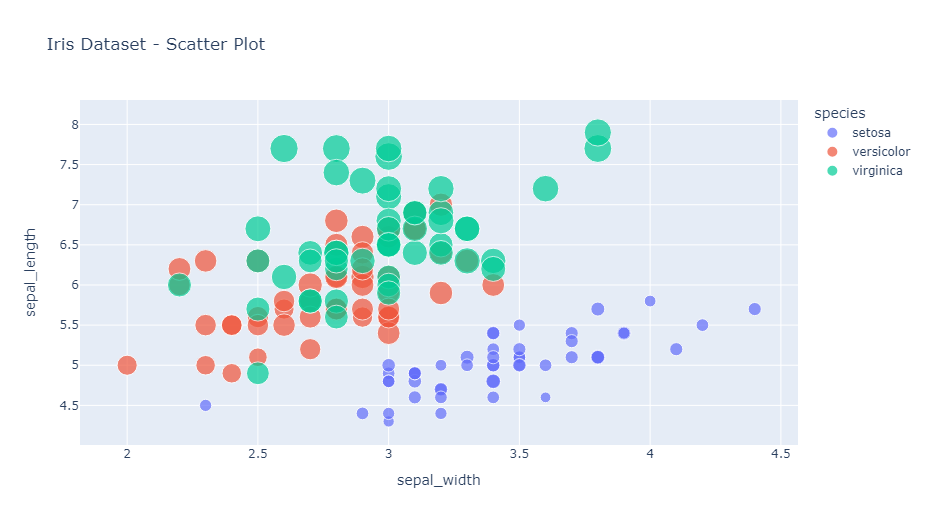colorパラメータで種別を色分けし、sizeパラメータで花弁の長さを点の大きさで表現しています。