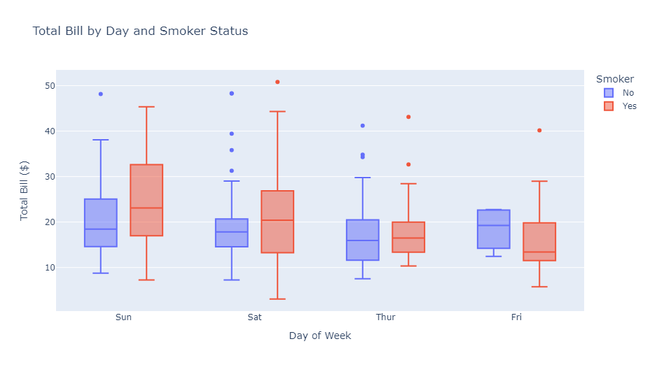 チップのデータセットを使用して、曜日ごとの請求額の分布を喫煙者と非喫煙者で比較します。箱ひげ図は、各グループのデータの中央値、四分位範囲、外れ値を明確に示しています。
