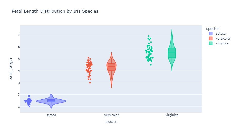 アイリスデータセットを使用して、品種ごとの花弁の長さの分布を示します。box=Trueオプションにより、箱ひげ図も同時に表示しています。また、points="all"により、個々のデータポイントも表示しています。
