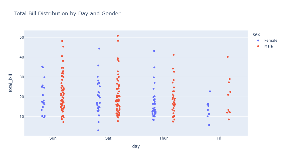チップのデータセットを使用して、曜日ごとの請求額の分布を性別で色分けして表示します。各ポイントは個々の請求額を表しており、ポイントの密度から分布の特徴を読み取ることができます。