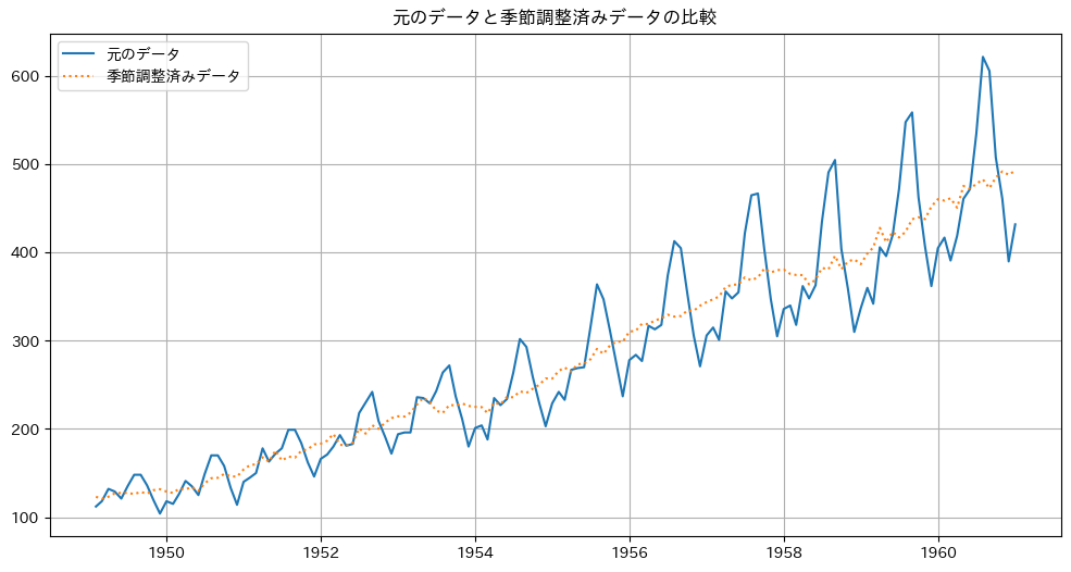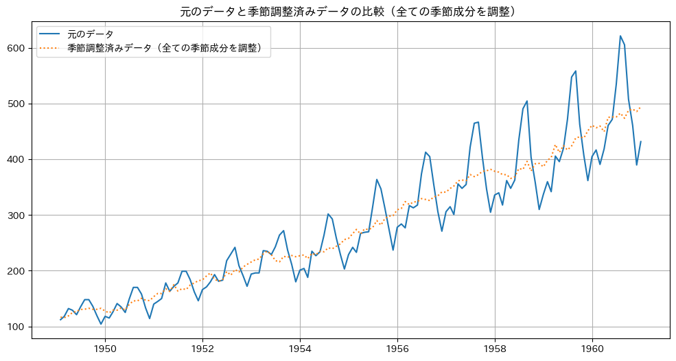 plt.title('元のデータと季節調整済みデータの比較(全ての季節成分を調整)')