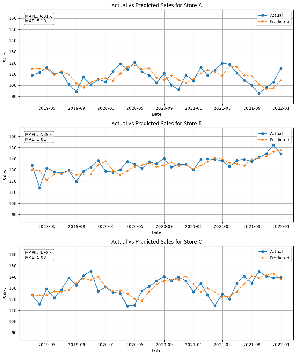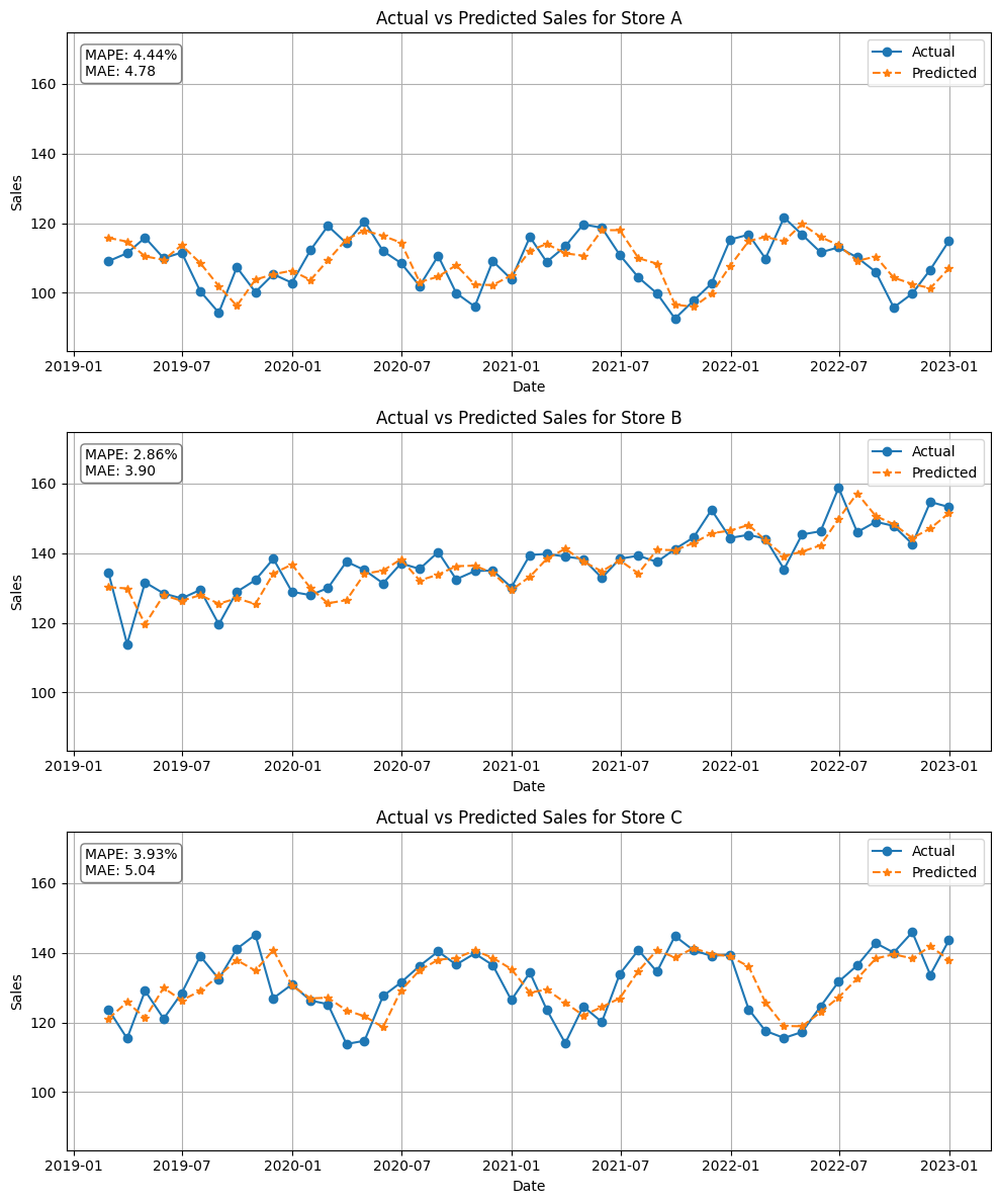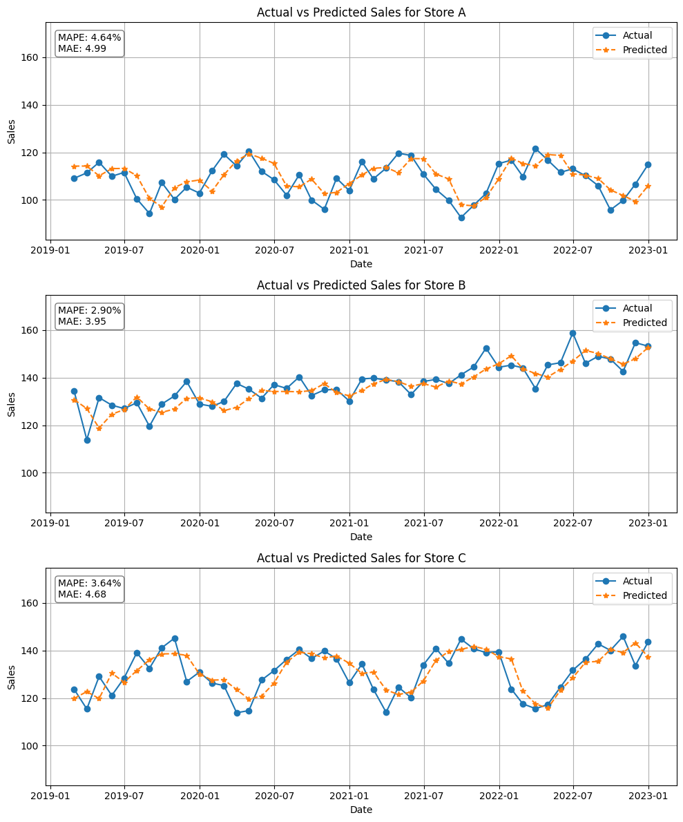 store_metrics.append({'store': store, 'mape': mape, 'mae': mae})