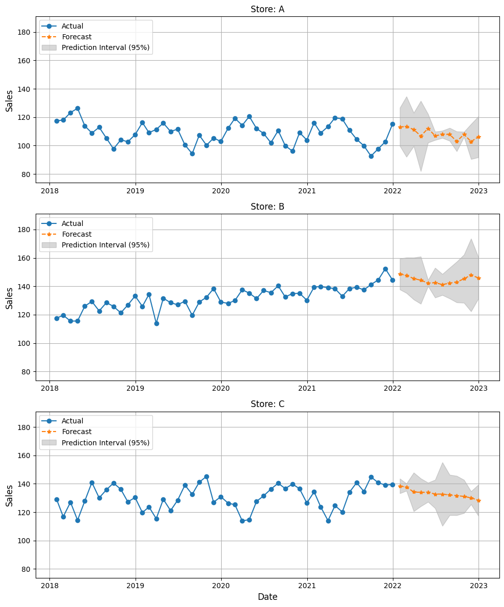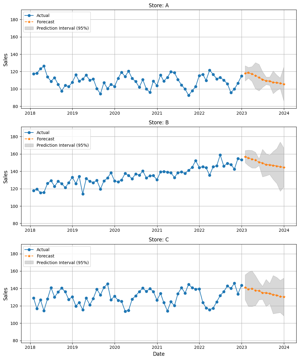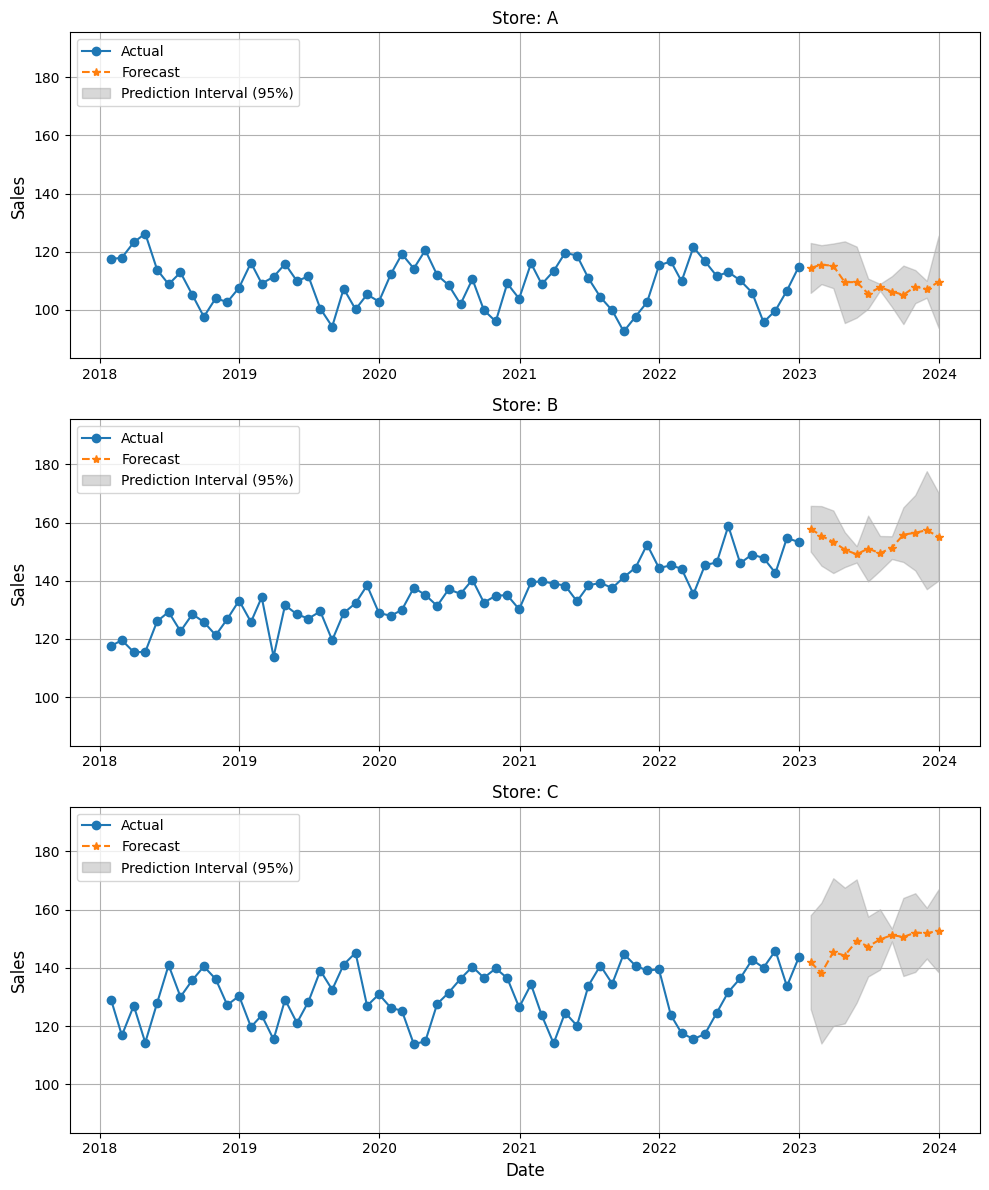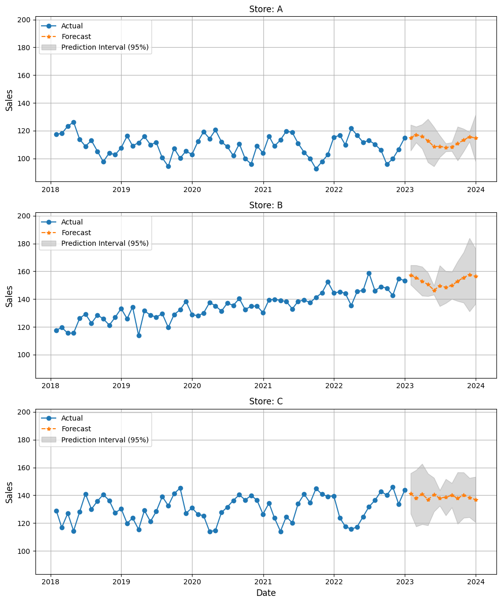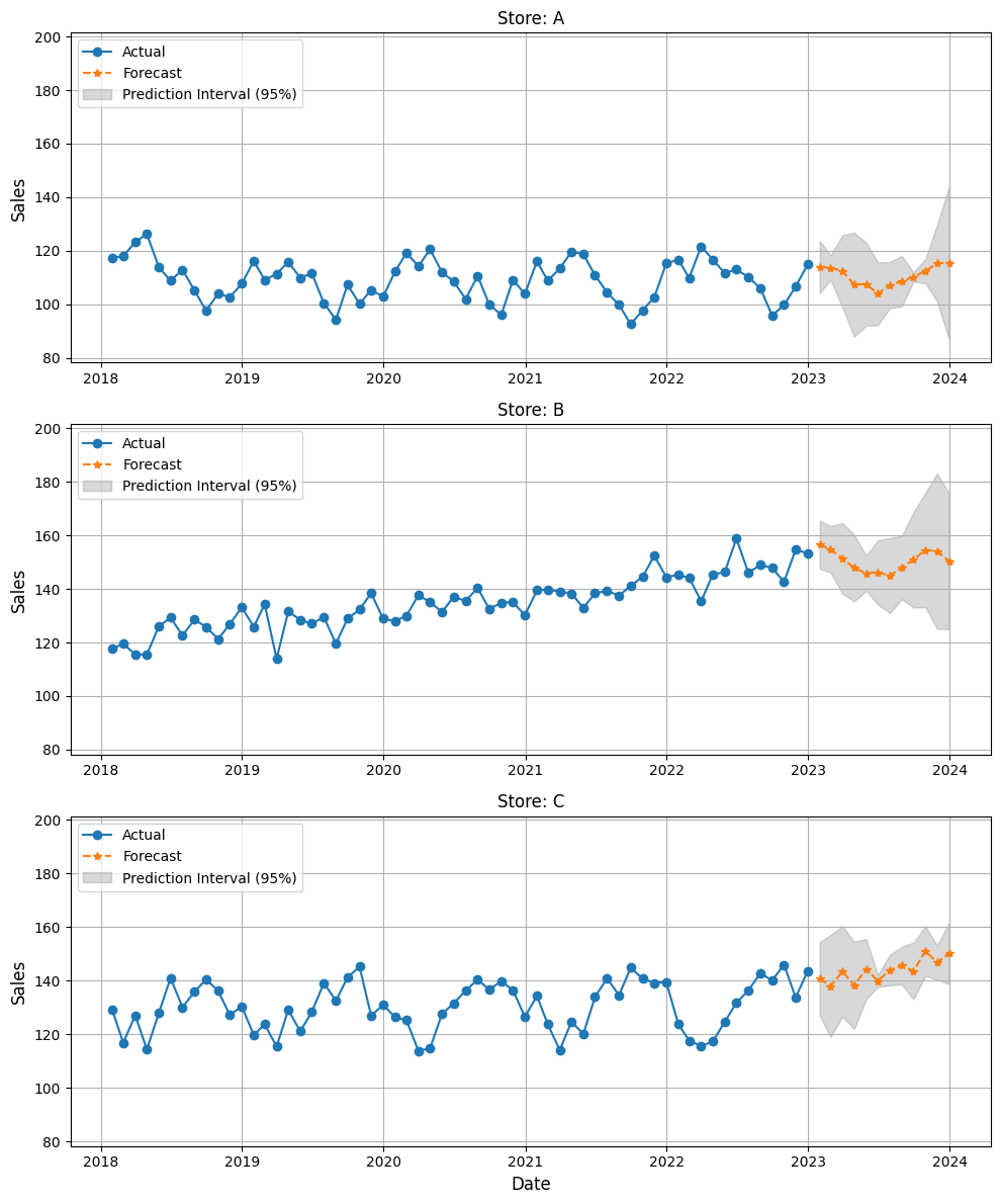 # 1年先の予測を実行 future_df = fcst.predict(h=12, level=[95]) # 予測結果をプロット plot_forecast(train_data, future_df, stores)