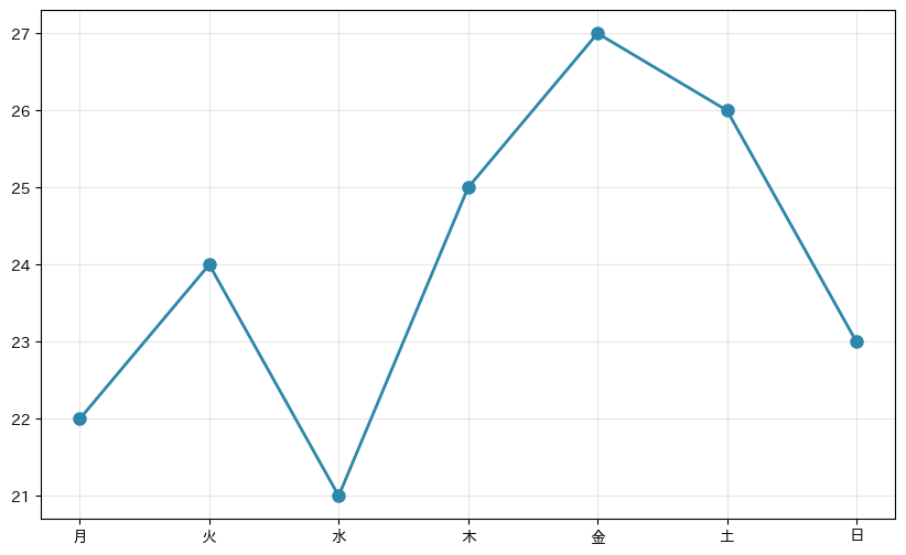 # より詳細なグラフを作成 plt.figure(figsize=(10, 6)) # グラフのサイズを指定 # 折れ線グラフを描画(マーカーを追加) plt.plot( days, # x軸のデータ(曜日) temperatures, # y軸のデータ(気温) marker='o', # マーカーの形状(丸) linestyle='-', # 線の種類(実線) color='#2E86AB',# 線の色(青系) linewidth=2, # 線の太さ markersize=8, # マーカーのサイズ label='気温' # 凡例のラベル ) # グリッドを追加 plt.grid(True, alpha=0.3)