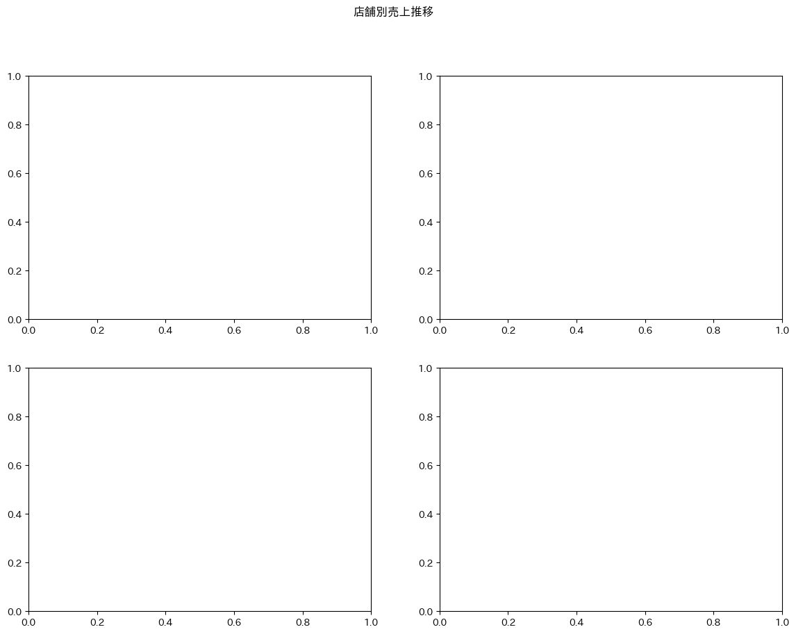 # 4つの店舗の月別売上を比較 months = ['1月', '2月', '3月', '4月', '5月', '6月'] shibuya = [520, 540, 510, 560, 580, 590] shinjuku = [480, 490, 500, 510, 520, 540] ikebukuro = [350, 360, 370, 380, 400, 420] shinagawa = [420, 430, 440, 450, 460, 470] # 2行2列のサブプロットを作成 fig, axes = plt.subplots( 2, # 行数 2, # 列数 figsize=(14, 10) # グラフのサイズ ) # グラフのタイトルを設定 fig.suptitle('店舗別売上推移') # グラフを表示 plt.show()